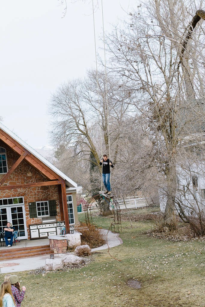 "The Swing" hangs from a very large tree in Hudson's backyard. The ropes are very long, and also, there is a rope attached to the bottom of the swing. This way, you can have someone, or multiple people, pull back on the rope and get you very high in the air.